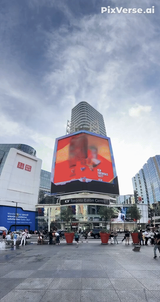 This video was created utlizing a combination of two videos. One of the street scene and building plus a separate video of the monster. The street video is an actual video of The Eaton Centre in Toronto, Canada. The monster was AI generated.